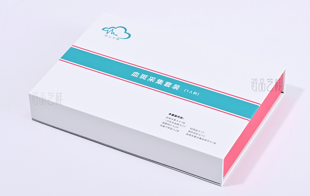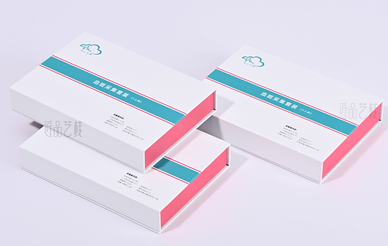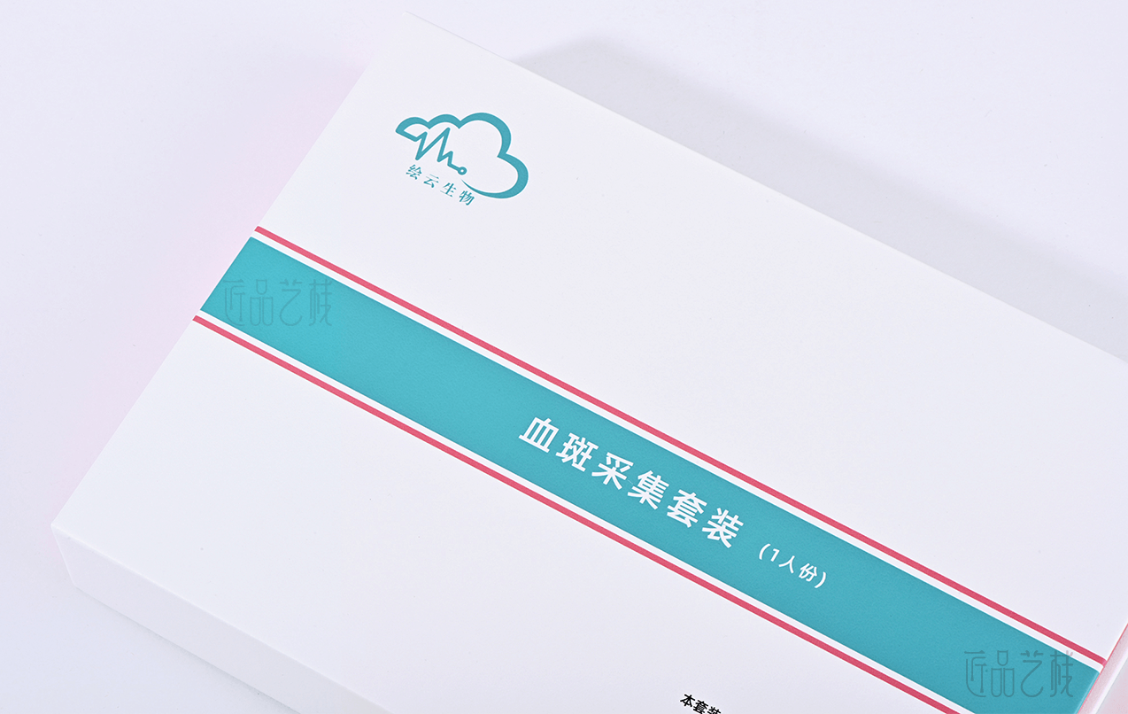 繪云生物科技,國家高新技術(shù)企業(yè),自有一系列自主知識產(chǎn)權(quán)的體外診斷試劑盒、智能輔助軟件和健康飲品和多項科研和醫(yī)學(xué)檢驗服務(wù)。針對該血斑采集試劑盒定位為高端檢測人群和渠道,佳潤隆包裝&匠品藝棧在設(shè)計印刷中,采用硬卡精裝結(jié)構(gòu)模式,運用科技藍和血斑粉紅為主色搭配,以簡約的風(fēng)格和精致的材質(zhì)、工藝,打造與繪云生物科技合作中又一優(yōu)秀包裝設(shè)計印刷案例。